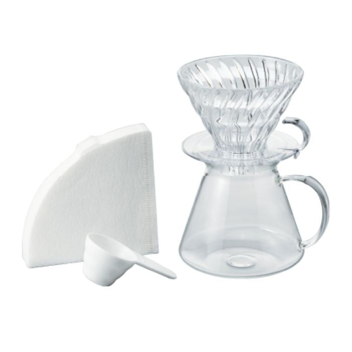 The Hario V60 Glass Brew Bundle is the quintessential kit for brewing filter coffee in the comfort of your own home or the gift to give for somebody starting their pourover journey at home with Hario’s premier dripper.